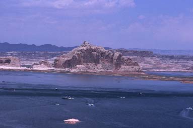 ボートが行き交うレイクパウエル 展望台からの光景